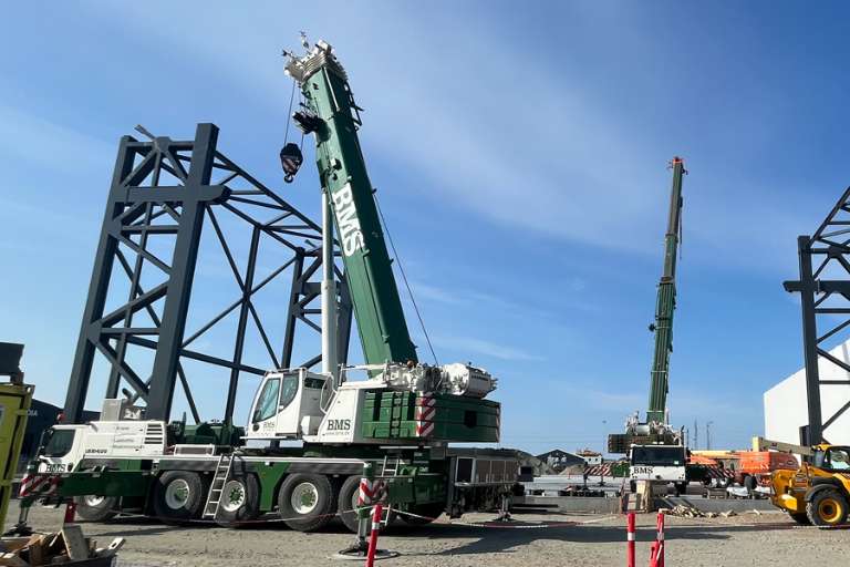 Montagen af stålkonstruktionerne til en af verdens største bygninger til havvindmølleindustrien lakker mod enden på Esbjerg Havn.